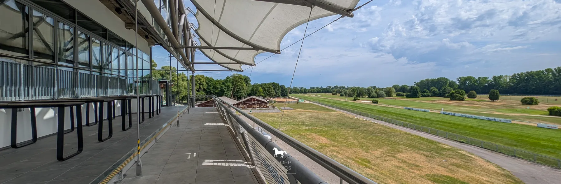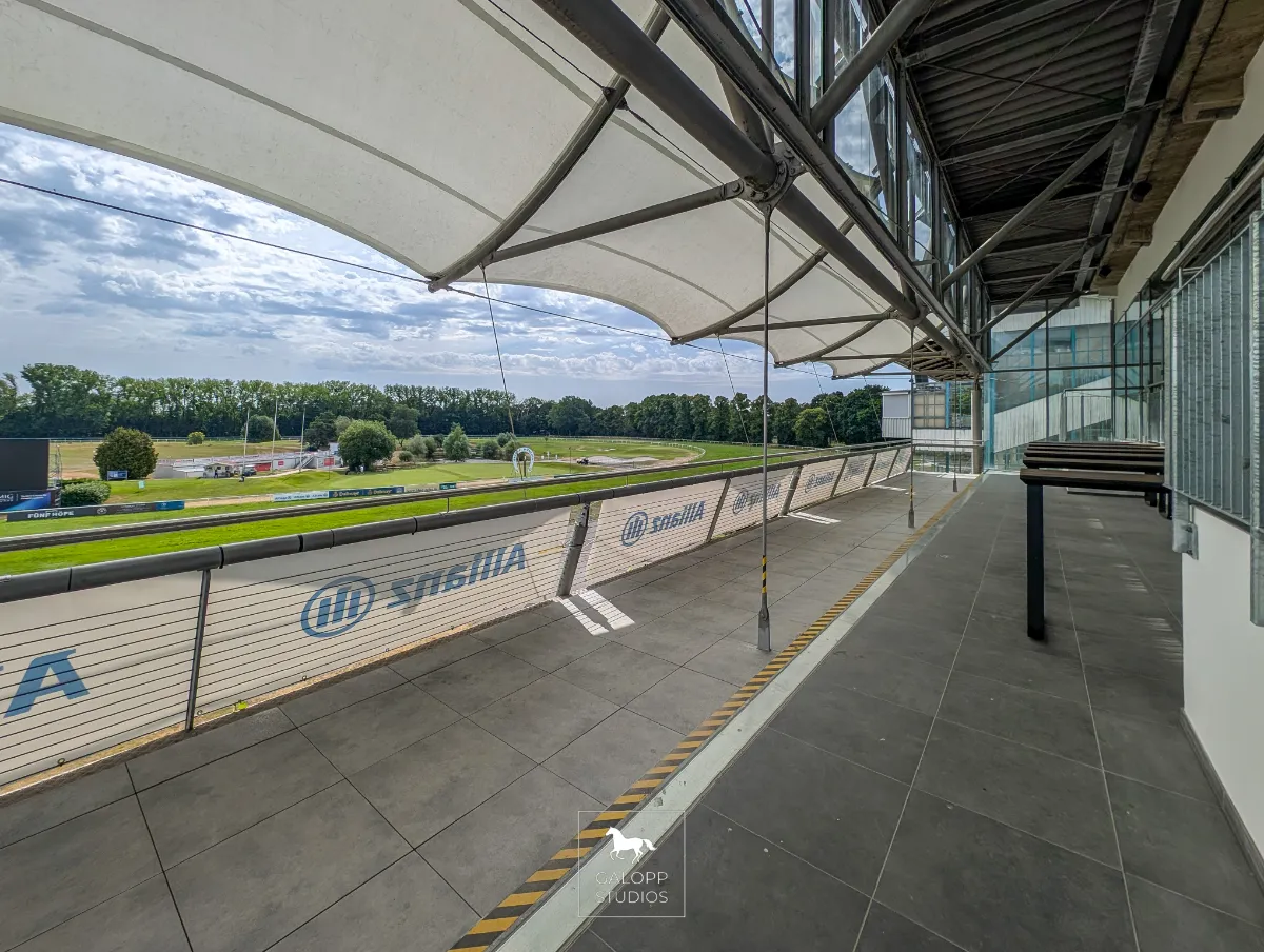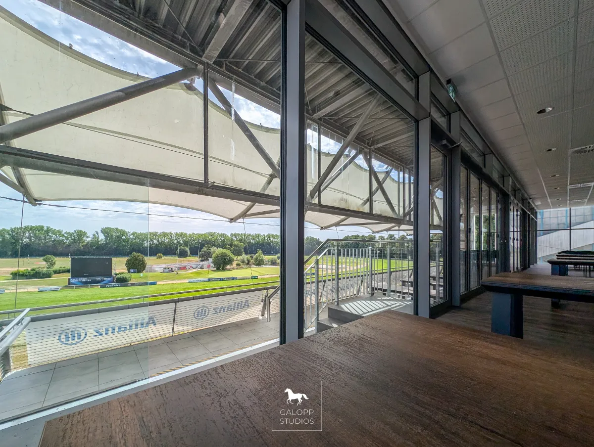 Ein besonderes Highlight ist die teilverglaste, wetterfeste Terrasse mit weiteren 60 Quadratmetern, die den Blick über das Gelände der Galopprennbahn München-Riem öffnet – ideal für Empfänge, Pausenbereiche oder exklusive Außenflächen.