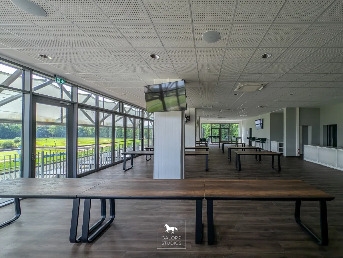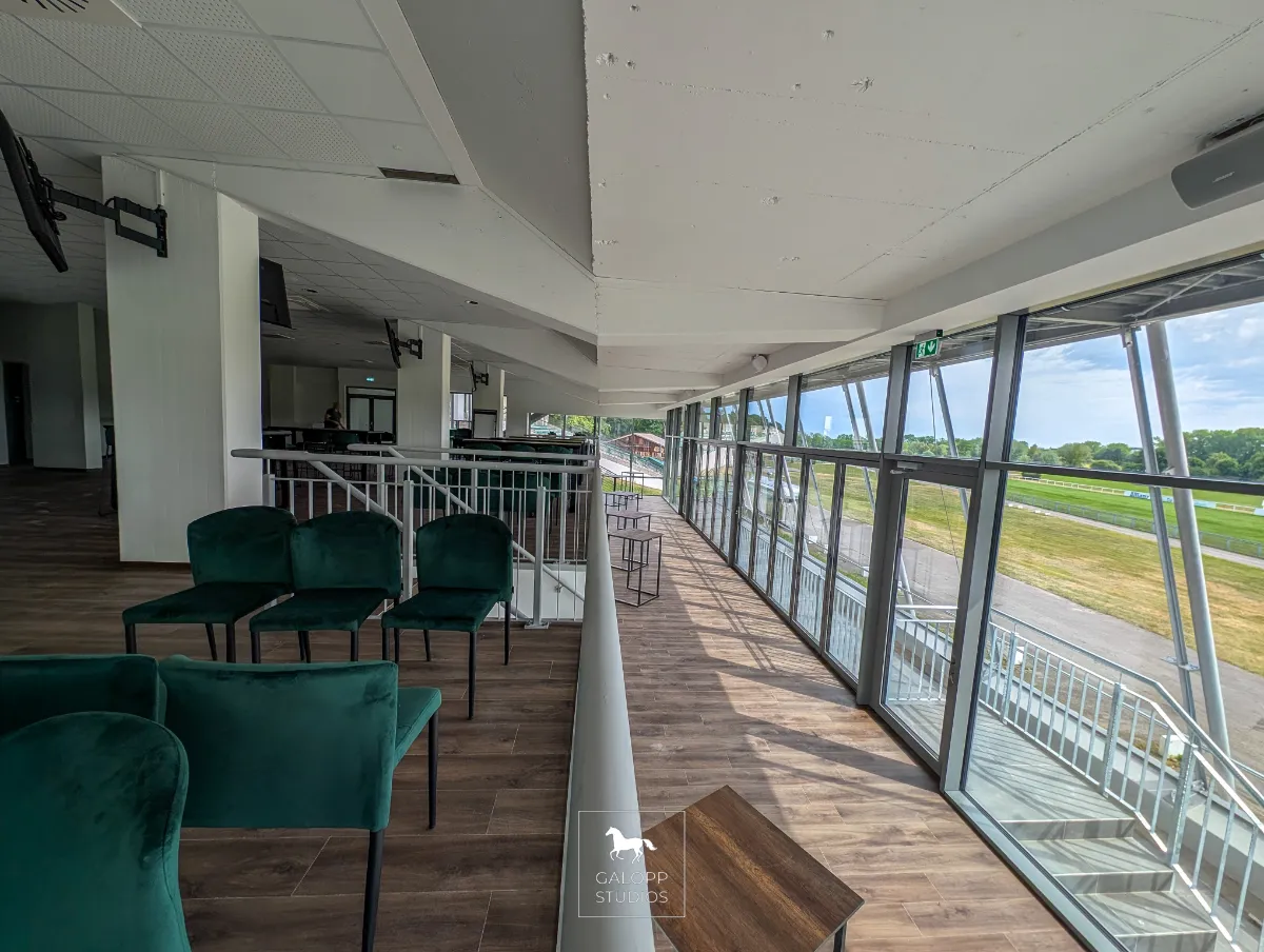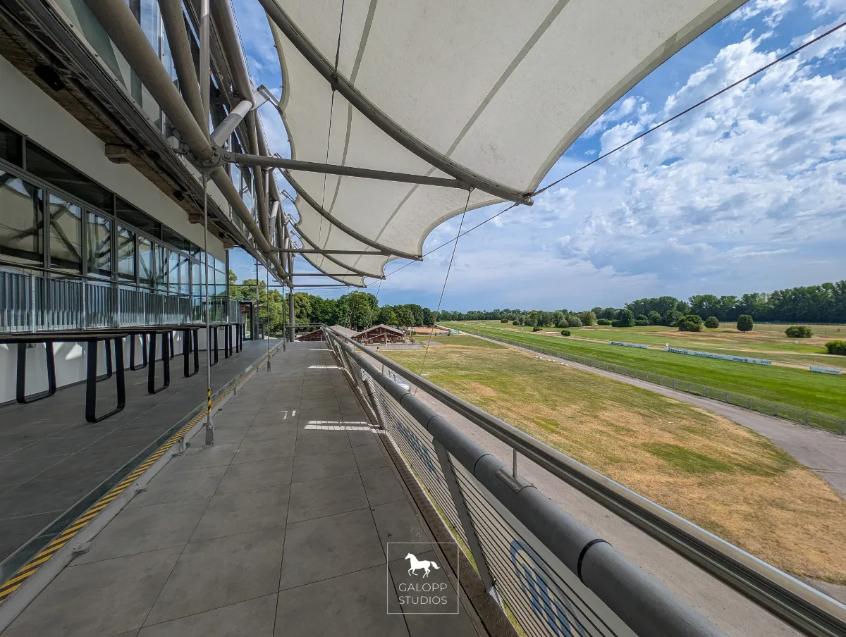 Ein besonderes Highlight ist die teilverglaste, wetterfeste Terrasse mit weiteren 60 Quadratmetern, die den Blick über das Gelände der Galopprennbahn München-Riem öffnet – ideal für Empfänge, Pausenbereiche oder exklusive Außenflächen.