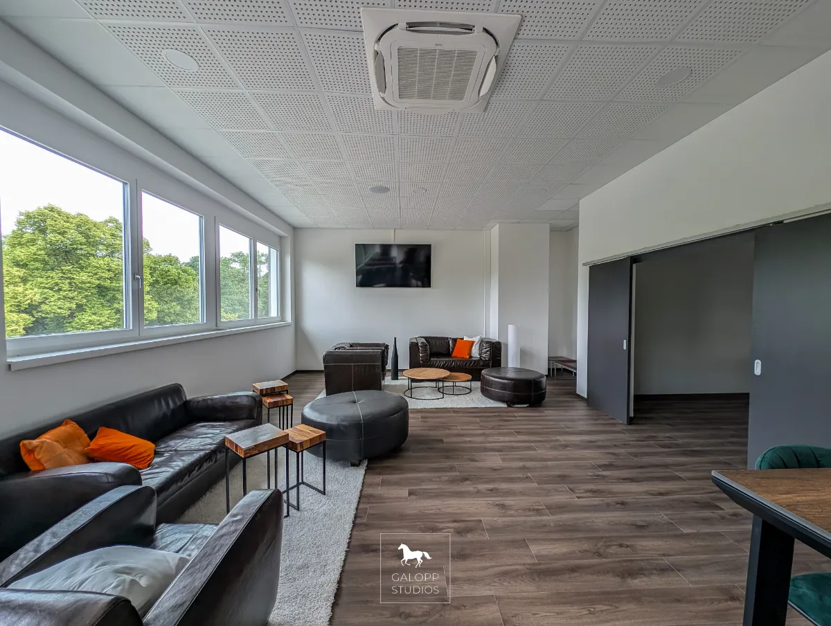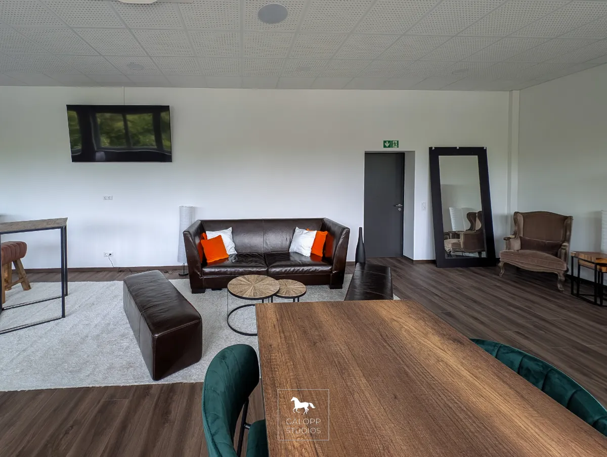 Wie alle GALOPP STUDIOS ist auch The Lounge voll klimatisiert, barrierefrei zugänglich und mit moderner technischer Infrastruktur ausgestattet. Hier verschmelzen Komfort, Stil und Funktionalität zu einer Atmosphäre, in der Begegnungen auf besondere Weise wirken.