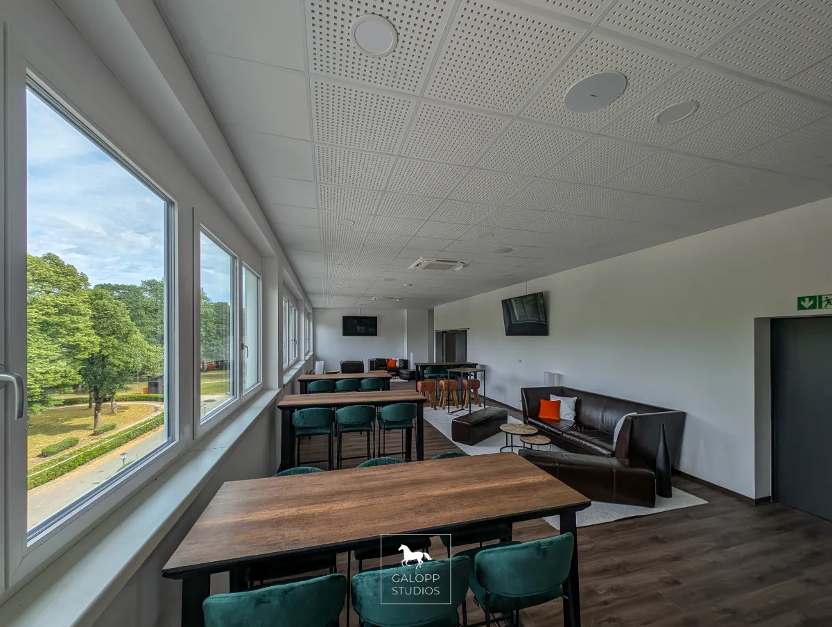 Rückzugsort, Statement, Erlebnisraum – STUDIO 3 – The Lounge ist die exklusivste Fläche der GALOPP STUDIOS. Auf 95 Quadratmetern entsteht eine besondere Atmosphäre, die Eleganz und Behaglichkeit verbindet. Großflächige Fenster tauchen den Raum in natürliches Licht und öffnen den Blick auf das Gelände der Galopprennbahn München-Riem.